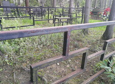 Дополнительно устанавливаем напротив надгробий металлические лавочку и столик, сидение скамьи изготовлено из дерева.