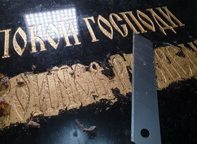 При помощи лезвия от канцелярского ножа мы зачищаем надпись – здесь важно не поцарапать гранит, но в то же время давить с достаточной силой, чтобы соскрести лишнее золото с каменной поверхности.