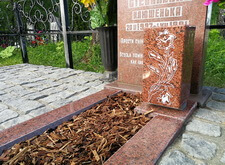 Цветник укрыли корой, у подножья надгробья поставили прямоугольную вазу с гравировкой. На фотографиях крупным планом видно, что новые гранитные элементы, изготовленные нами, немного ярче памятника. Это произошло из-за достаточно большого отрезка времени, которое прошло с момента установки надгробья. Полировка с него немного стёрлась, тогда как установленные нами дополнения были изготовлены совсем недавно.